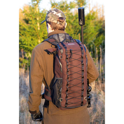 Rygsækken Tyr er udviklet til aktive jægere, der har brug for fuld bevægelsesfrihed. Slankt design, stærkt og unikt støjsvagt materiale. Et stort delbart hovedrum med åbning i toppen og ekstra adgang i bunden. Rumadskiller med lynlås. Super åndbart bæresystem i trampolinmateriale. Bredt polstret hoftebælte. Våbenholder og holder til skydestok. To sidelommer og en netlomme. Vendbart regnovertræk i grøn/hvid.