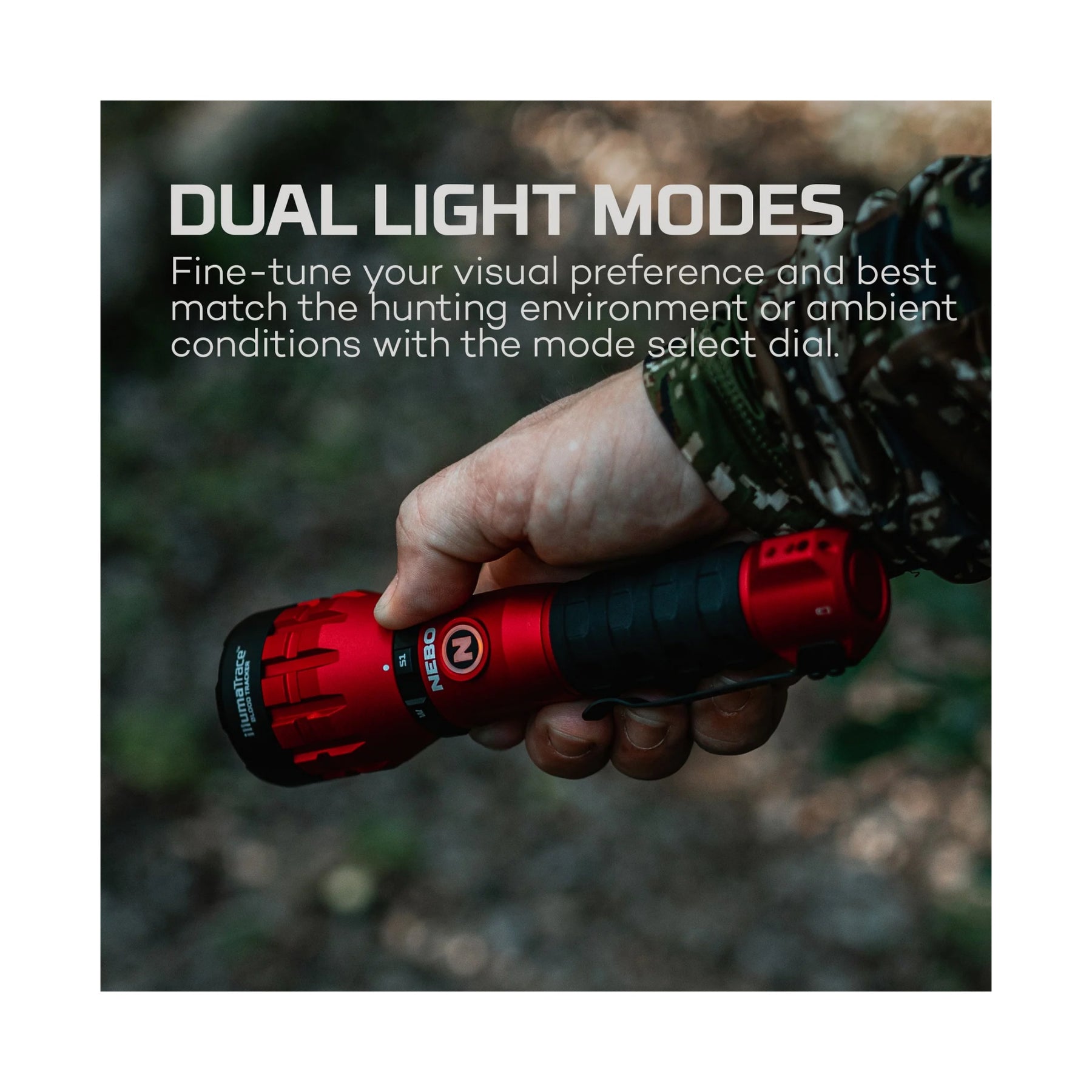 Storvildtsjagt kræver ofte enorme ressourcer og en dedikeret indsats – uden garanti for succes. Det værst tænkelige scenarie er, at en jæger afgiver et skud, men ikke kan finde blodspor og derfor ikke får vildtet med hjem. Med NEBO’s patentanmeldte ILLUMATRACE™-teknologi får du et banebrydende værktøj, der gør blodspor synlige gennem en dynamisk strobe-effekt. Effekten fremhæver blodet mod forskellige baggrunde og underlag.
